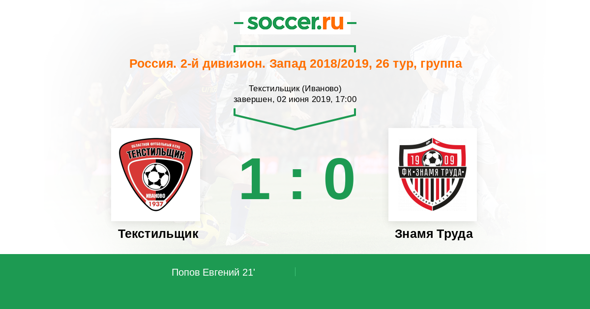 Россия. Вторая лига. Группа 2 18.07.2018 Знамя Труда Логотип футбольный клуб Знамя Труда (Орехово-Зуево) 0:1 Логотип футбольный клуб Текстильщик (Иваново) Текстильщик