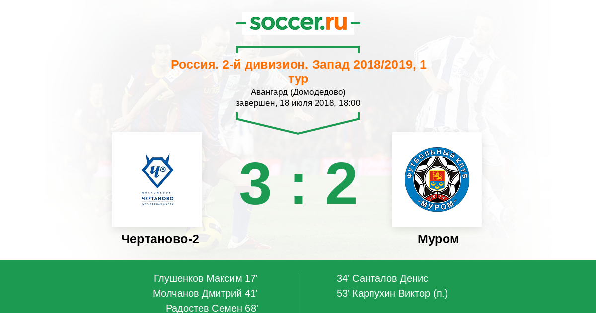 Россия. Вторая лига. Группа 2 31.05.2019 Муром Логотип футбольный клуб Муром 3:0 Логотип футбольный клуб Чертаново-2 Чертаново-2
