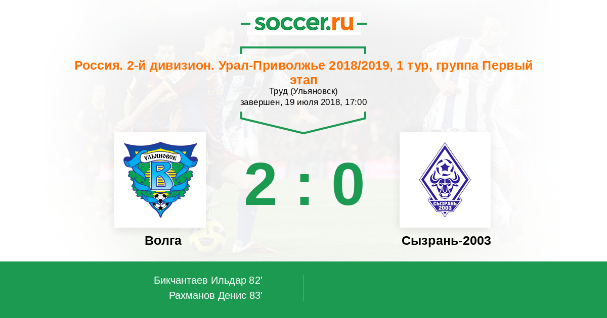 Россия. Вторая лига. Группа 4 03.08.2017 Сызрань-2003 Логотип футбольный клуб Сызрань-2003 2:1 Логотип футбольный клуб Волга (Ульяновск) Волга