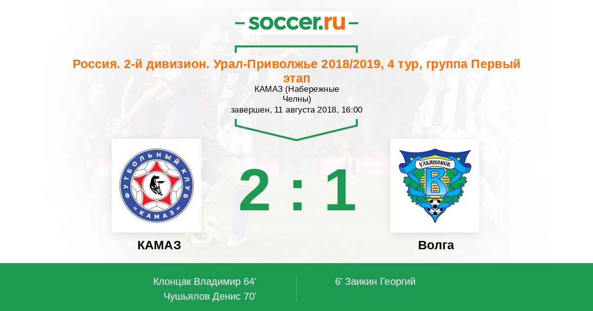 Россия. Вторая лига. Группа 4 01.08.2019 КАМАЗ Логотип футбольный клуб КАМАЗ (Набережные Челны) 4:0 Логотип футбольный клуб Волга (Ульяновск) Волга