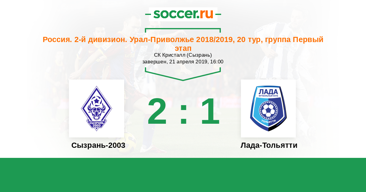 Россия. Вторая лига. Группа 4 21.04.2019 Сызрань-2003 Логотип футбольный клуб Сызрань-2003 2:1 Логотип футбольный клуб Лада-Тольятти Лада-Тольятти