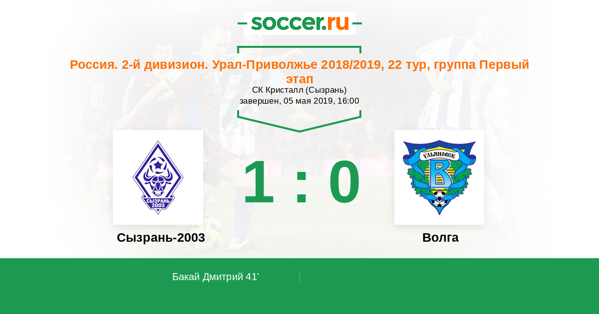 Россия. Вторая лига. Группа 4 05.05.2019 Сызрань-2003 Логотип футбольный клуб Сызрань-2003 1:0 Логотип футбольный клуб Волга (Ульяновск) Волга