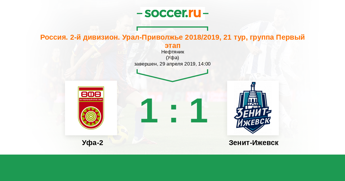 Россия. Вторая лига. Группа 4 11.05.2019 Зенит-Ижевск Логотип футбольный клуб Зенит-Ижевск 2:2 Логотип футбольный клуб Уфа-2 Уфа-2
