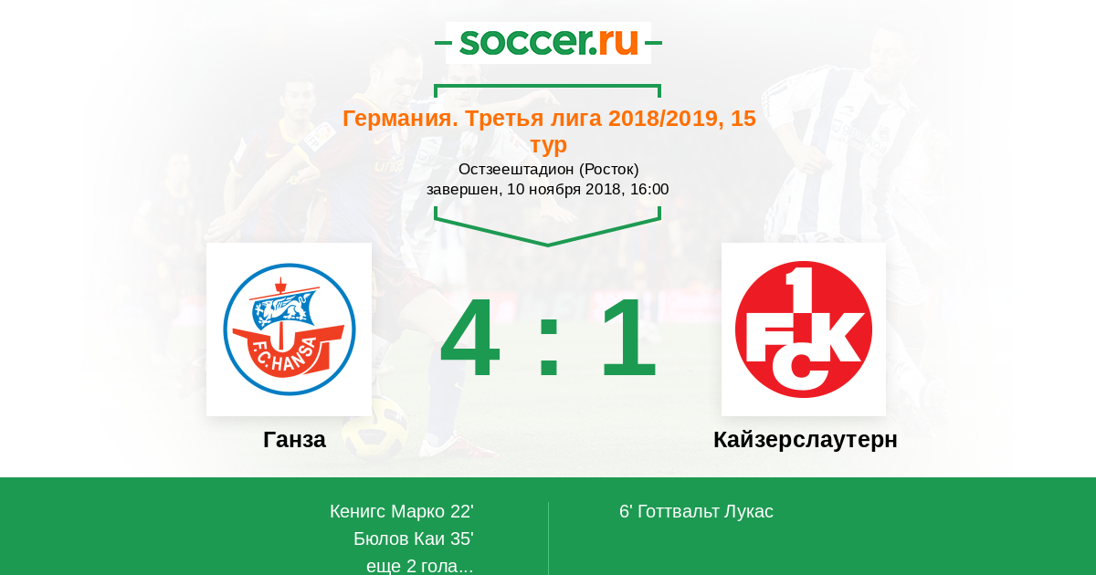 Германия. Третья лига 24.11.2019 Кайзерслаутерн Логотип футбольный клуб Кайзерслаутерн 2:0 Логотип футбольный клуб Ганза (Росток) Ганза