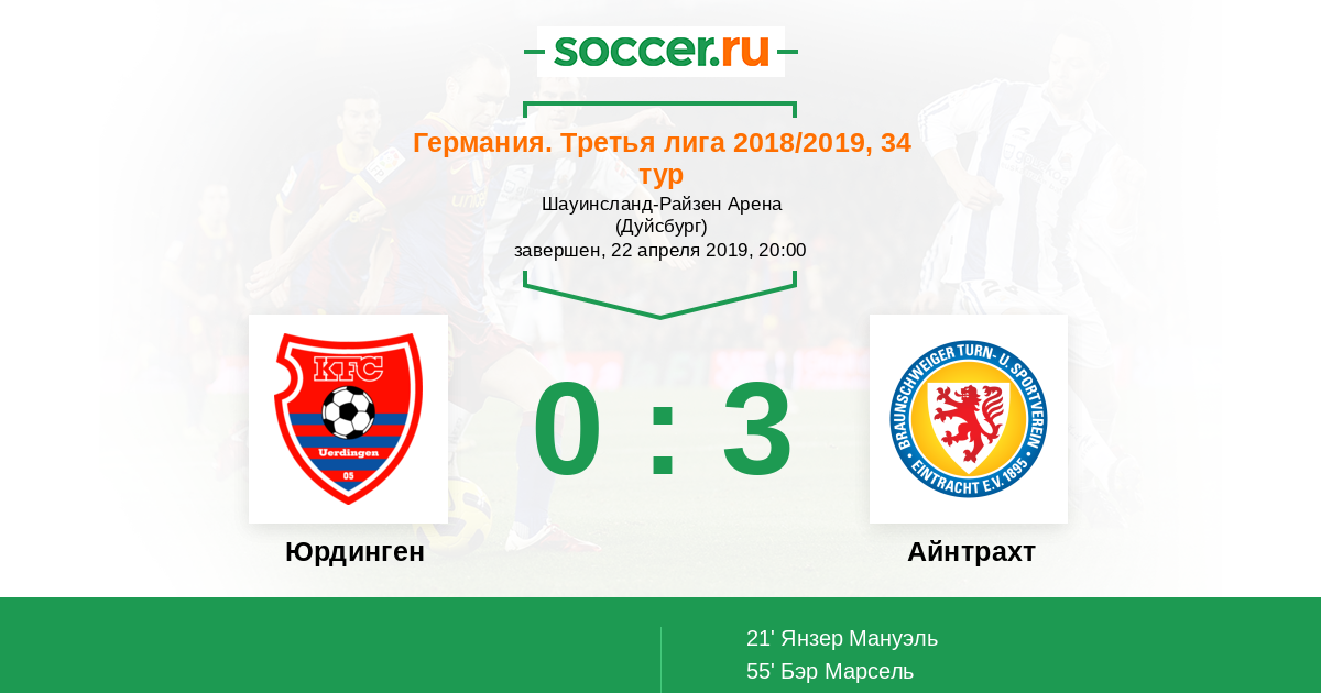 Германия. Третья лига 10.11.2018 Айнтрахт Логотип футбольный клуб Айнтрахт (Брауншвейг) 0:2 Логотип футбольный клуб Юрдинген (Крефельд) Юрдинген