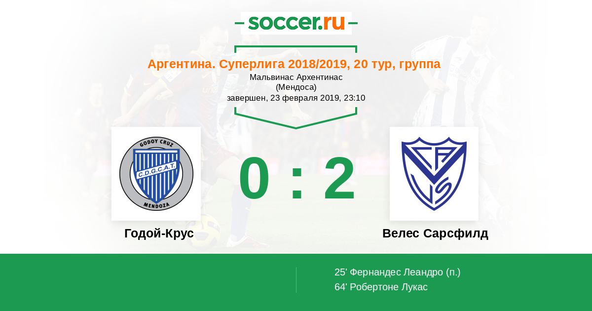 Аргентина. Суперлига 05.03.2020 Велес Сарсфилд Логотип футбольный клуб Велес Сарсфилд (Буэнос-Айрес) 0:1 Логотип футбольный клуб Годой-Крус Годой-Крус