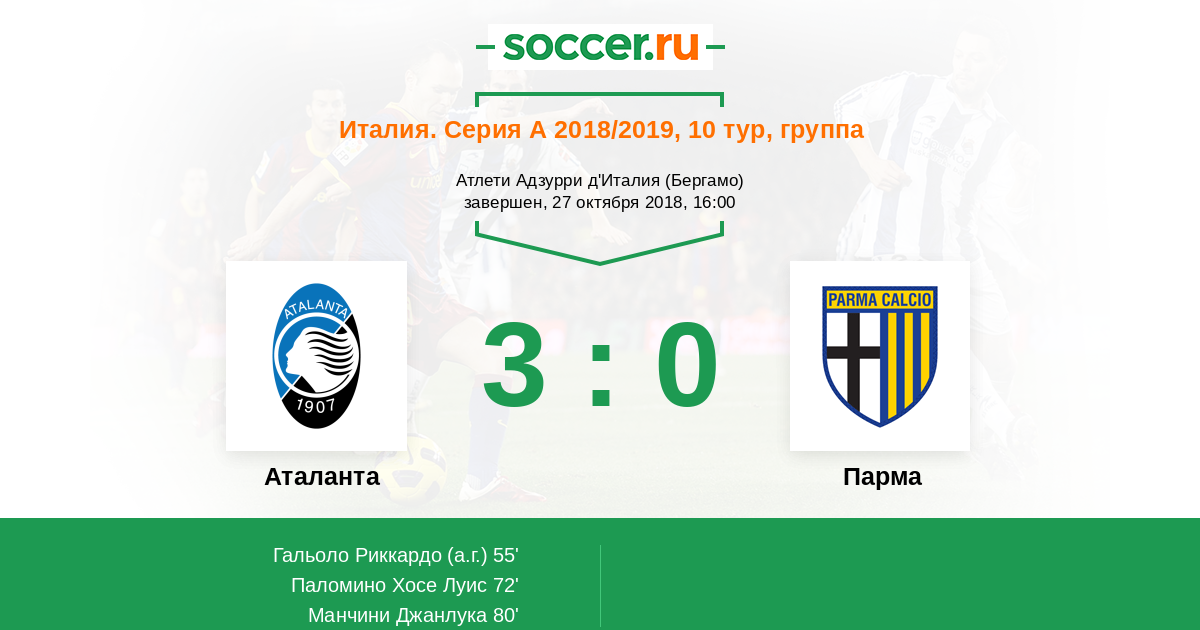 Италия. Серия А 06.01.2021 Аталанта Логотип футбольный клуб Аталанта (Бергамо) 3:0 Логотип футбольный клуб Парма Парма