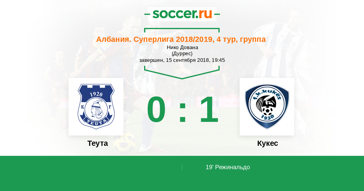 Албания. Суперлига 28.09.2019 Теута Логотип футбольный клуб Теута (Дуррес) 1:0 Логотип футбольный клуб Кукес Кукес