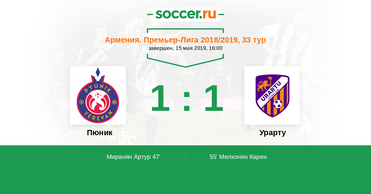 Армения. Премьер-лига 31.03.2019 Урарту Логотип футбольный клуб Урарту (Ереван) 1:1 Логотип футбольный клуб Пюник (Ереван) Пюник