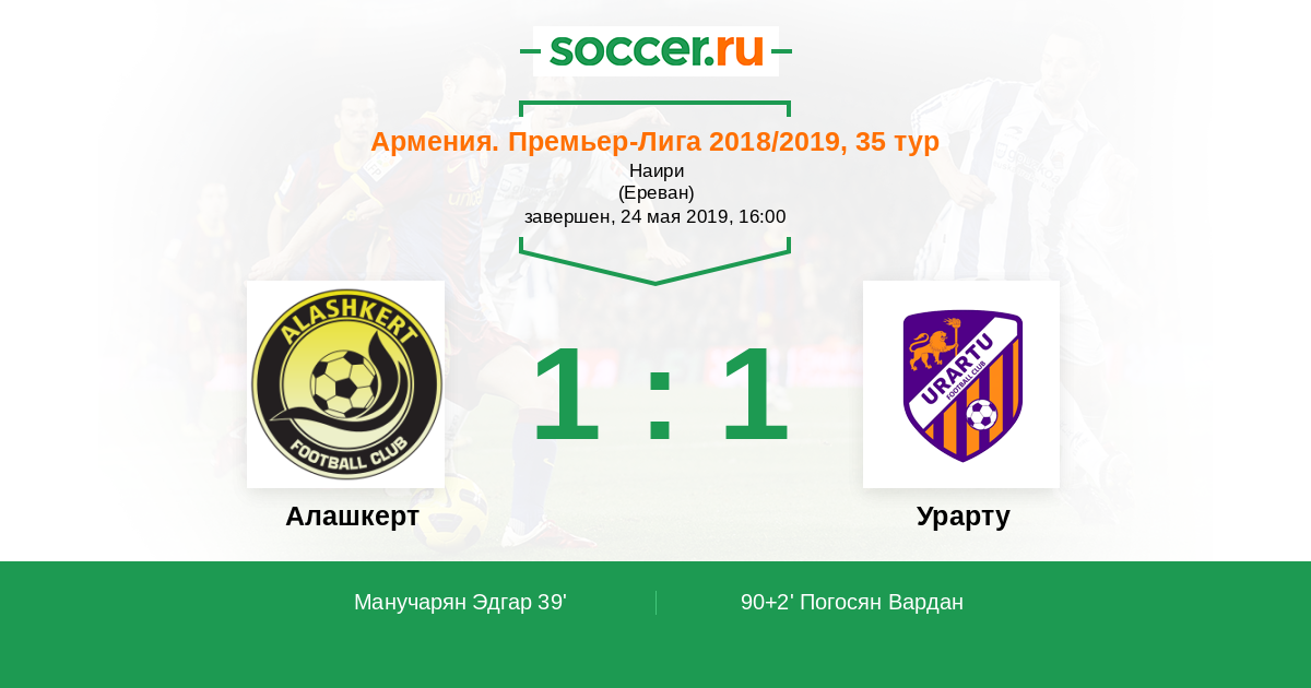 Армения. Премьер-лига 10.04.2019 Урарту Логотип футбольный клуб Урарту (Ереван) 2:0 Логотип футбольный клуб Алашкерт (Мартуни) Алашкерт