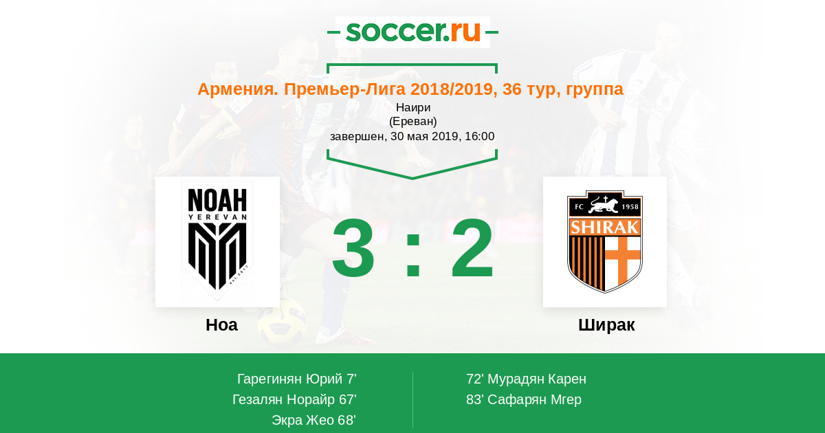Армения. Премьер-лига 11.05.2021 Ноа Логотип футбольный клуб Ноа (Ереван) 3:0 Логотип футбольный клуб Ширак (Гюмри) Ширак