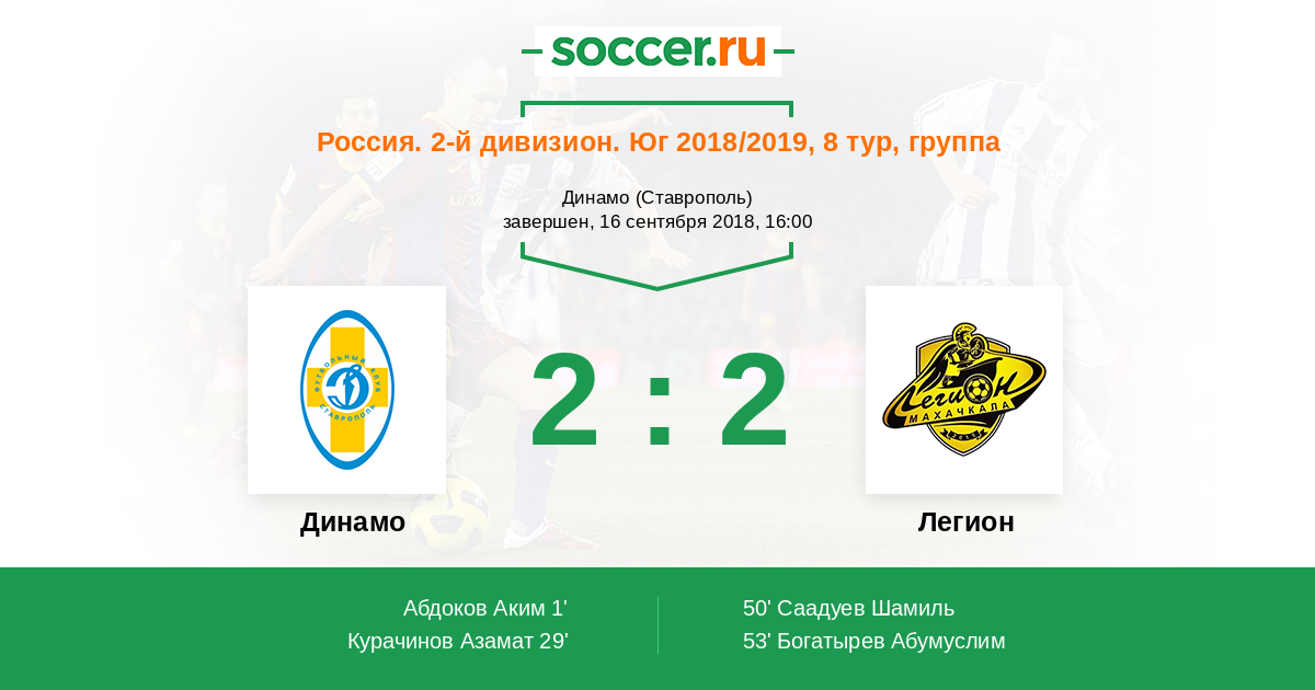 Россия. Вторая лига. Группа 1 09.10.2016 Легион Логотип футбольный клуб Легион (Махачкала) 1:2 Логотип футбольный клуб Динамо Ставрополь Динамо Ставрополь