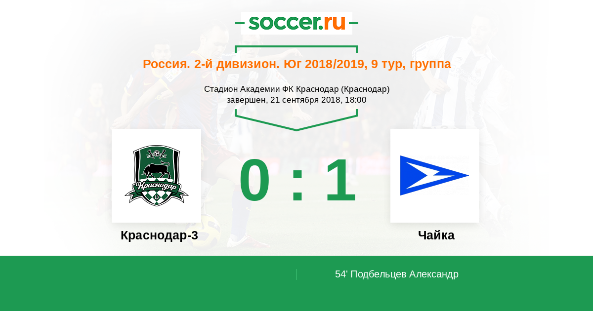 Россия. Вторая лига. Группа 1 15.04.2019 Чайка Логотип футбольный клуб Чайка (Песчанокопское) 5:0 Логотип футбольный клуб Краснодар-3 Краснодар-3