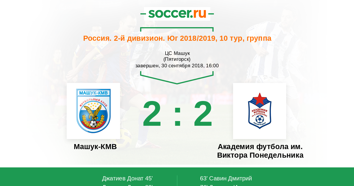 Россия. Вторая лига. Группа 1 21.04.2019 Академия футбола им. Виктора Понедельника Логотип футбольный клуб Академия футбола им. Виктора Понедельника (Батайск) 0:3 Логотип футбольный клуб Машук-КМВ (Пятигорск) Машук-КМВ