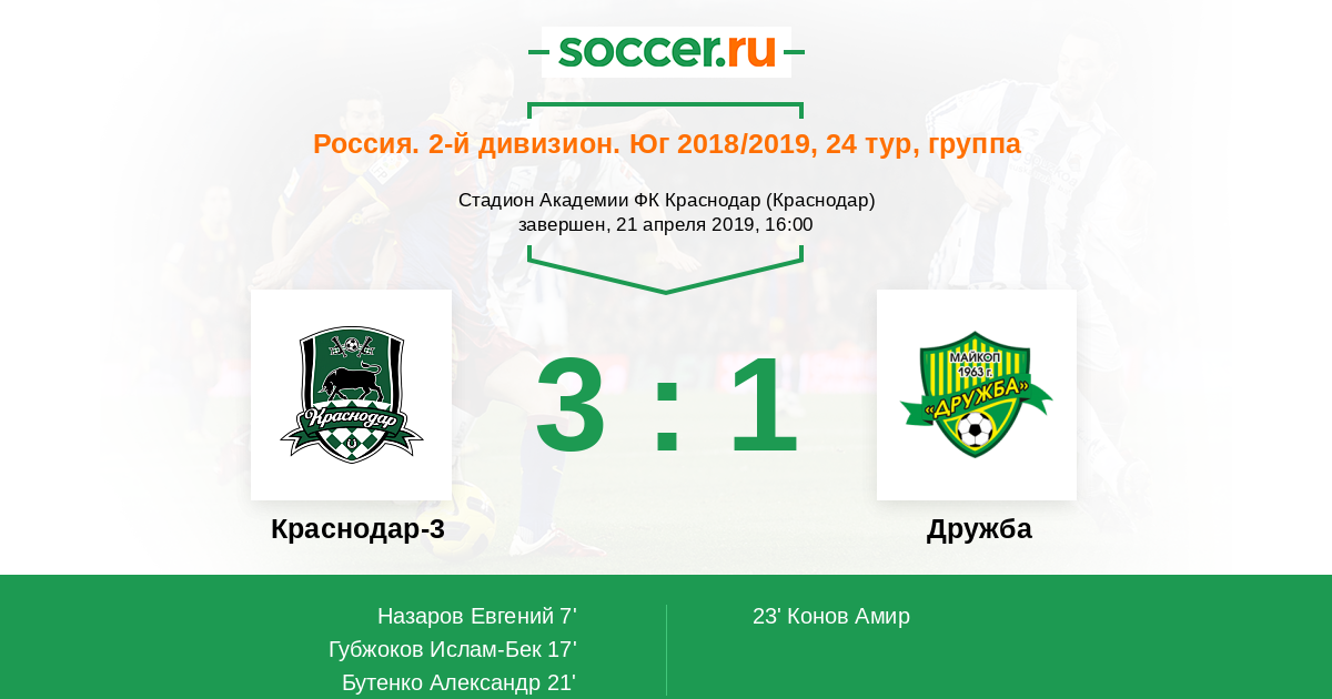 Россия. Вторая лига. Группа 1 10.05.2021 Краснодар-3 Логотип футбольный клуб Краснодар-3 1:0 Логотип футбольный клуб Дружба (Майкоп) Дружба