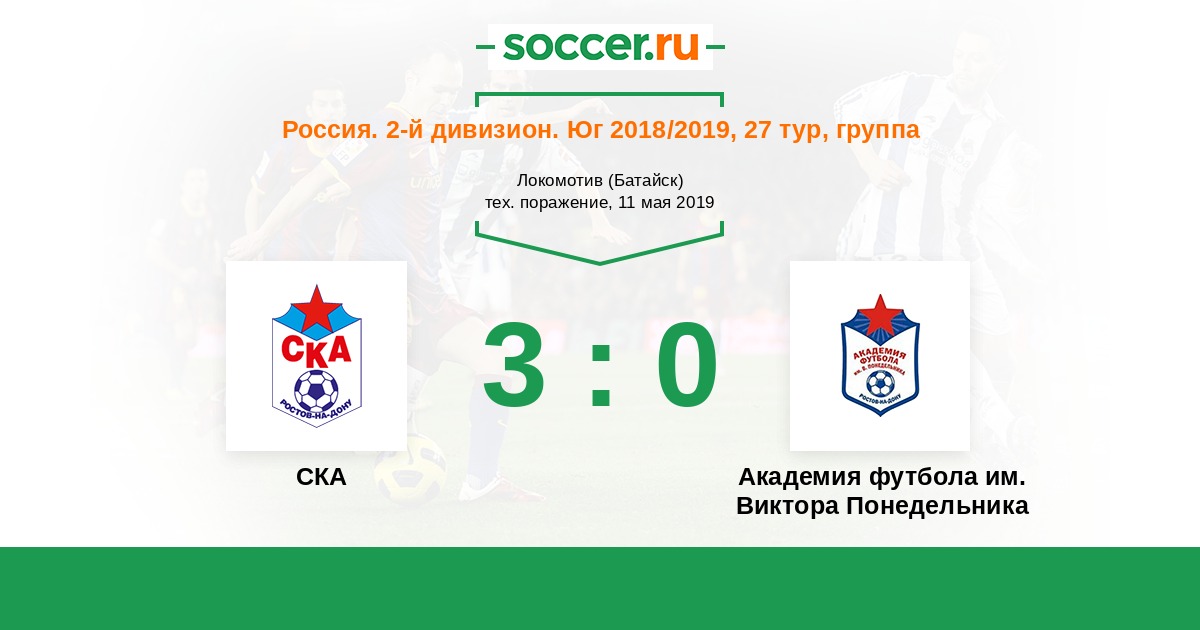 Россия. Вторая лига. Группа 1 11.05.2019 СКА   3:0 Логотип футбольный клуб Академия футбола им. Виктора Понедельника (Батайск) Академия футбола им. Виктора Понедельника