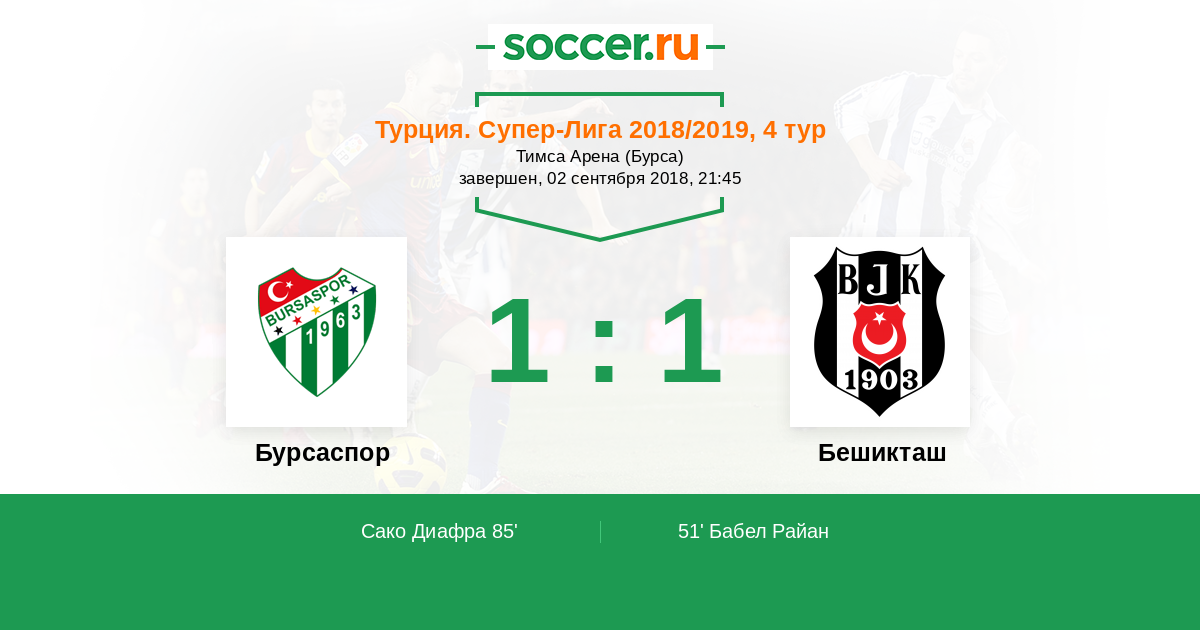 Турция. Суперлига 02.02.2018 Бурсаспор Логотип футбольный клуб Бурсаспор 2:2 Логотип футбольный клуб Бешикташ (Стамбул) Бешикташ