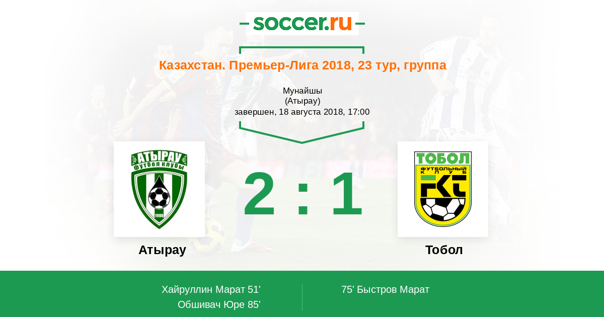 Казахстан. Премьер-лига 17.06.2018 Атырау Логотип футбольный клуб Атырау 0:2 Логотип футбольный клуб Тобол (Костанай) Тобол