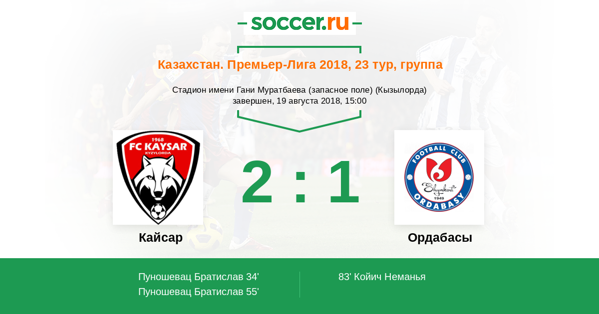 Казахстан. Премьер-лига 10.08.2012 Кайсар Логотип футбольный клуб Кайсар (Кызылорда) 2:1 Логотип футбольный клуб Ордабасы (Шымкент) Ордабасы