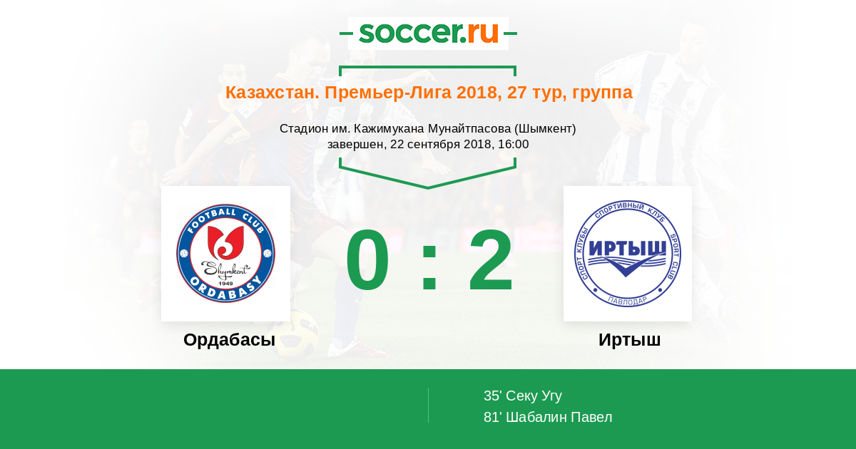 Казахстан. Премьер-лига 05.05.2018 Ордабасы Логотип футбольный клуб Ордабасы (Шымкент) 1:0 Логотип футбольный клуб Иртыш (Павлодар) Иртыш