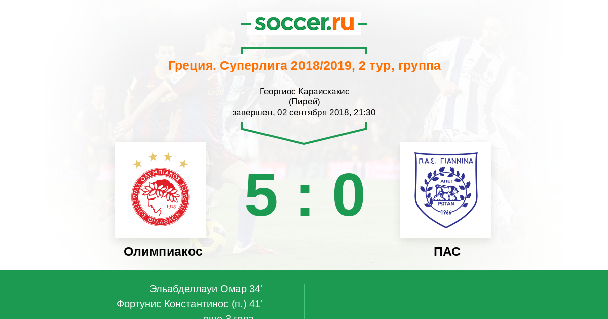 Греция. Суперлига 21.08.2022 Олимпиакос Логотип футбольный клуб Олимпиакос (Пирей) 2:0 Логотип футбольный клуб ПАС (Яннина) ПАС