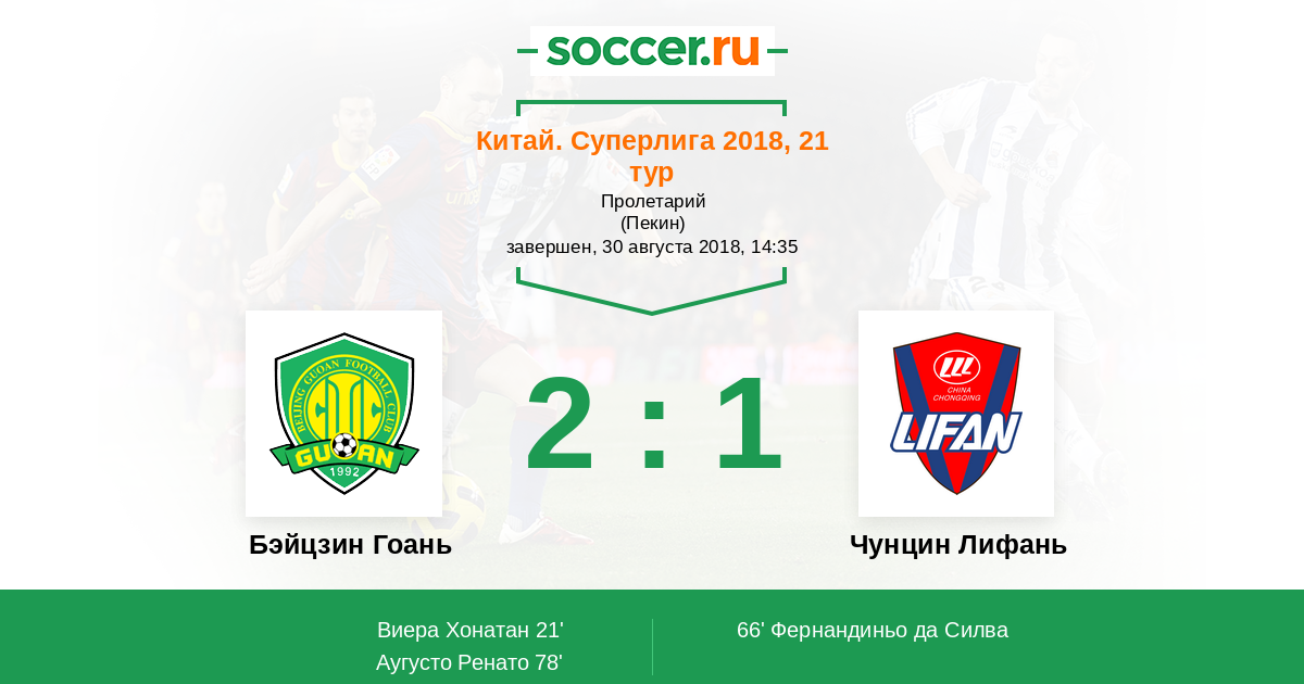 Китай. Суперлига 26.07.2020 Чунцин Лифань Логотип футбольный клуб Чунцин Лифань 1:2 Логотип футбольный клуб Бэйцзин Гоань (Пекин) Бэйцзин Гоань