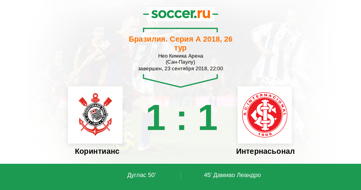 Бразилия. Серия А 27.05.2018 Интернасьонал Логотип футбольный клуб Интернасьонал (Порту-Алегри) 2:1 Логотип футбольный клуб Коринтианс (Сан-Паулу) Коринтианс