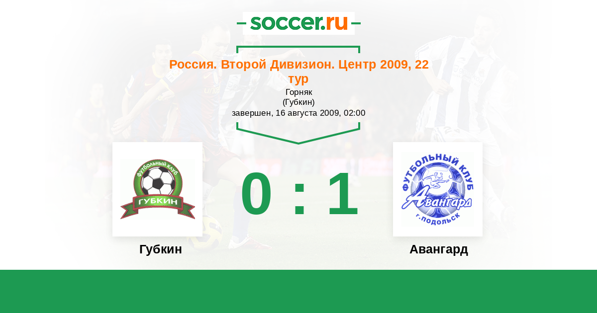 Россия. Вторая лига. Группа 3 17.05.2009 Авангард Логотип футбольный клуб Авангард (Подольск) 1:0 Логотип футбольный клуб Губкин Губкин