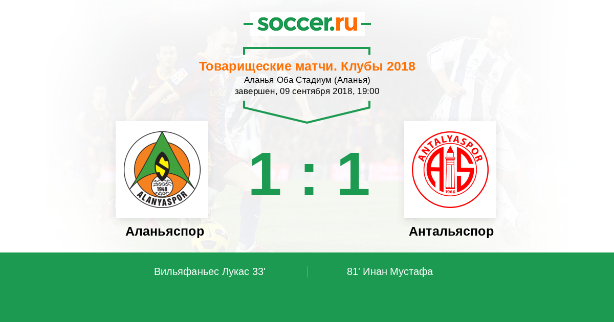 Товарищеские матчи. Клубы 05.08.2018 Антальяспор Логотип футбольный клуб Антальяспор 0:2 Логотип футбольный клуб Аланьяспор Аланьяспор
