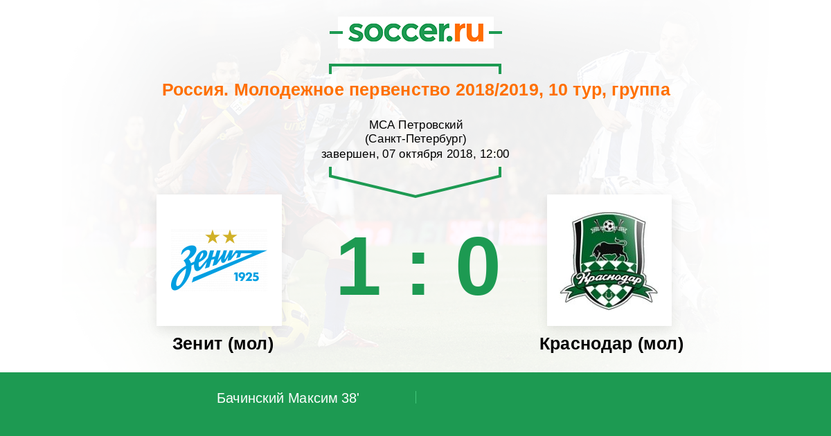Россия. Премьер-Лига U21 07.04.2018 Зенит (мол) Логотип футбольный клуб Зенит (мол) (Санкт-Петербург) 0:2 Логотип футбольный клуб Краснодар (мол) Краснодар (мол)