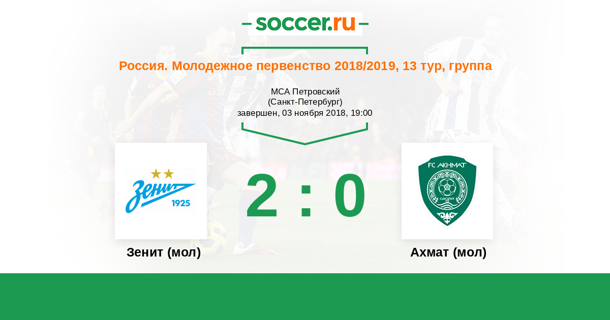 Россия. Премьер-Лига U21 13.08.2017 Зенит (мол) Логотип футбольный клуб Зенит (мол) (Санкт-Петербург) 2:1 Логотип футбольный клуб Ахмат (мол) (Грозный) Ахмат (мол)