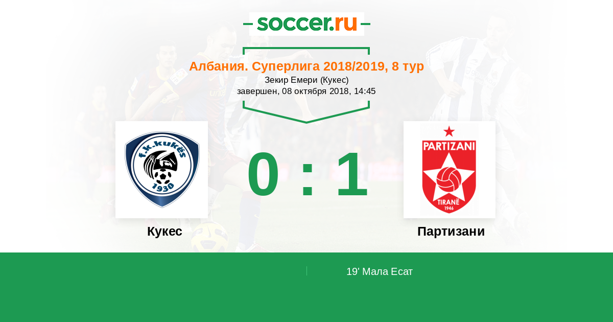 Албания. Суперлига 14.09.2014 Кукес Логотип футбольный клуб Кукес 0:1 Логотип футбольный клуб Партизани (Тирана) Партизани
