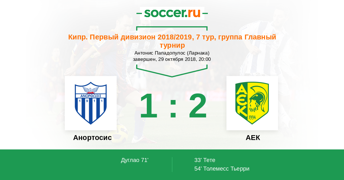 Кипр. Первый Дивизион 24.11.2012 АЕК Логотип футбольный клуб АЕК (Ларнака) 2:3 Логотип футбольный клуб Анортосис (Ларнака) Анортосис
