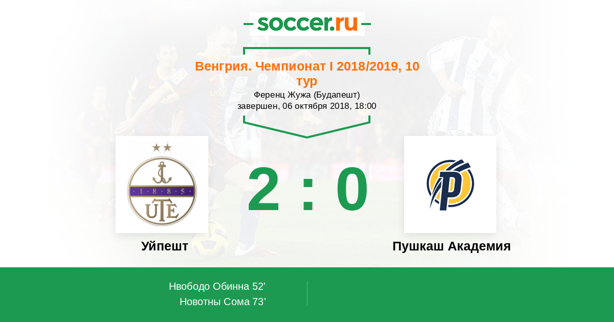 Венгрия. Чемпионат 1 09.11.2019 Пушкаш Академия Логотип футбольный клуб Пушкаш Академия (Фелксут) 1:3 Логотип футбольный клуб Уйпешт (Будапешт) Уйпешт
