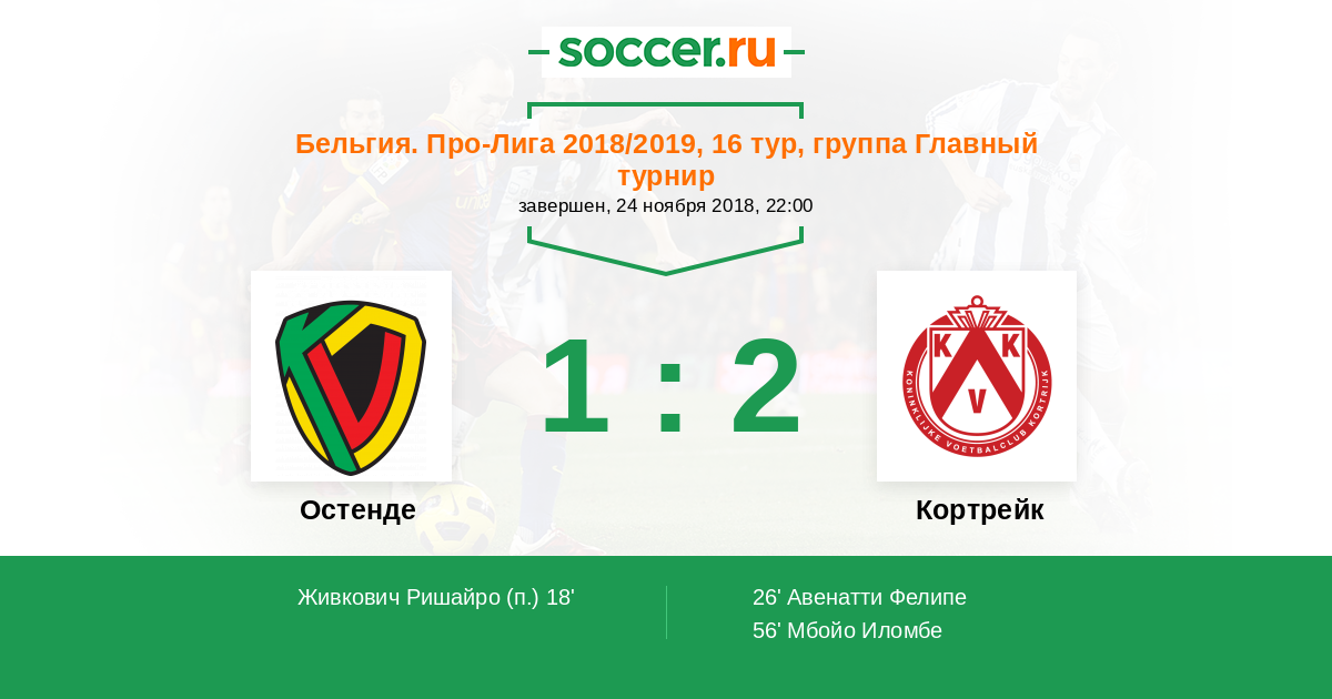 Бельгия. Про-Лига 18.08.2018 Кортрейк Логотип футбольный клуб Кортрейк 1:2 Логотип футбольный клуб Остенде Остенде