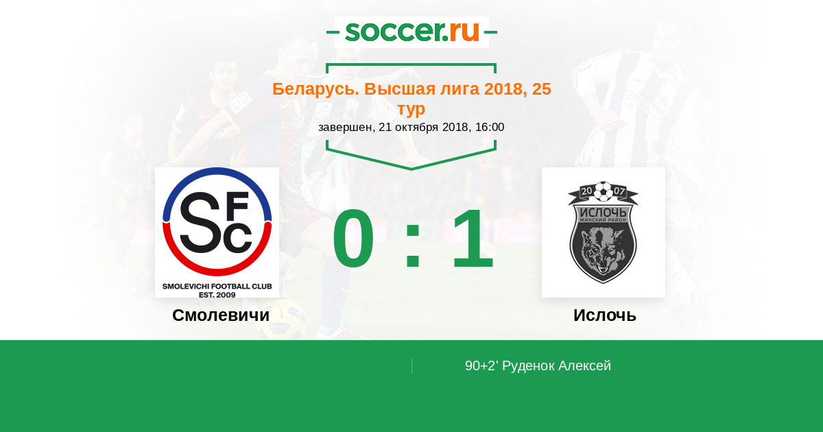 Беларусь. Первая лига 25.10.2014 Смолевичи-СТИ Логотип футбольный клуб Смолевичи-СТИ 3:4 Логотип футбольный клуб Ислочь (Минск) Ислочь