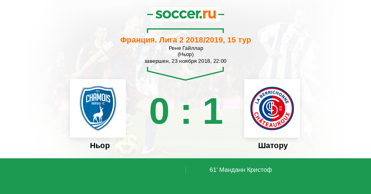 Франция. Лига 2 24.11.2017 Ньор Логотип футбольный клуб Ньор 2:1 Логотип футбольный клуб Шатору Шатору
