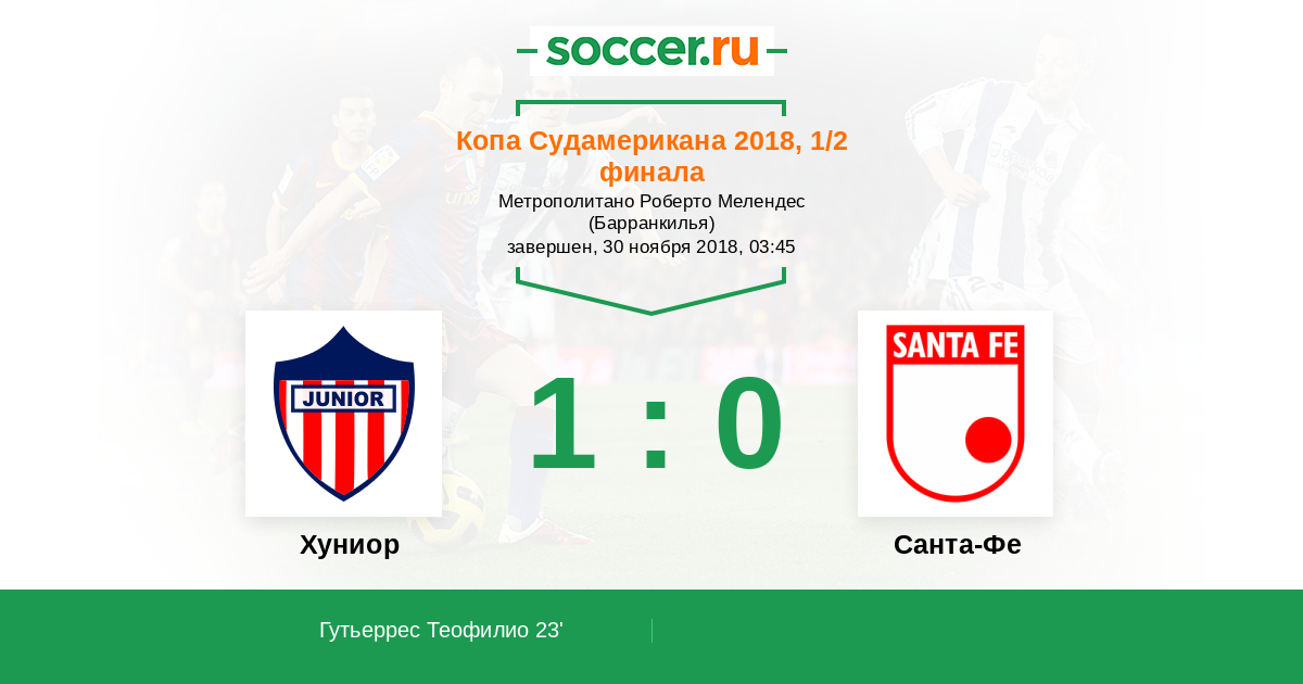 Копа Судамерикана 09.11.2018 Санта-Фе Логотип футбольный клуб Санта-Фе (Богота) 0:2 Логотип футбольный клуб Хуниор (Барранкилья) Хуниор