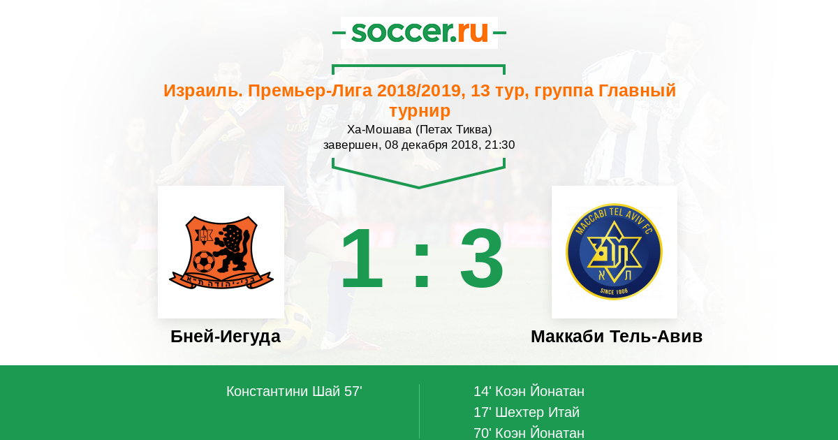 Израиль. Премьер-Лига 28.12.2013 Бней-Иегуда Логотип футбольный клуб Бней-Иегуда (Тель-Авив) 0:2 Логотип футбольный клуб Маккаби Тель-Авив Маккаби Тель-Авив