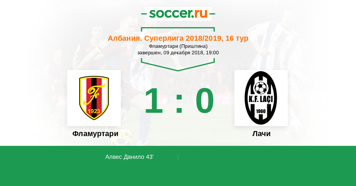 Албания. Суперлига 17.12.2017 Фламуртари Логотип футбольный клуб Фламуртари (Влера) 0:1 Логотип футбольный клуб Лачи Лачи