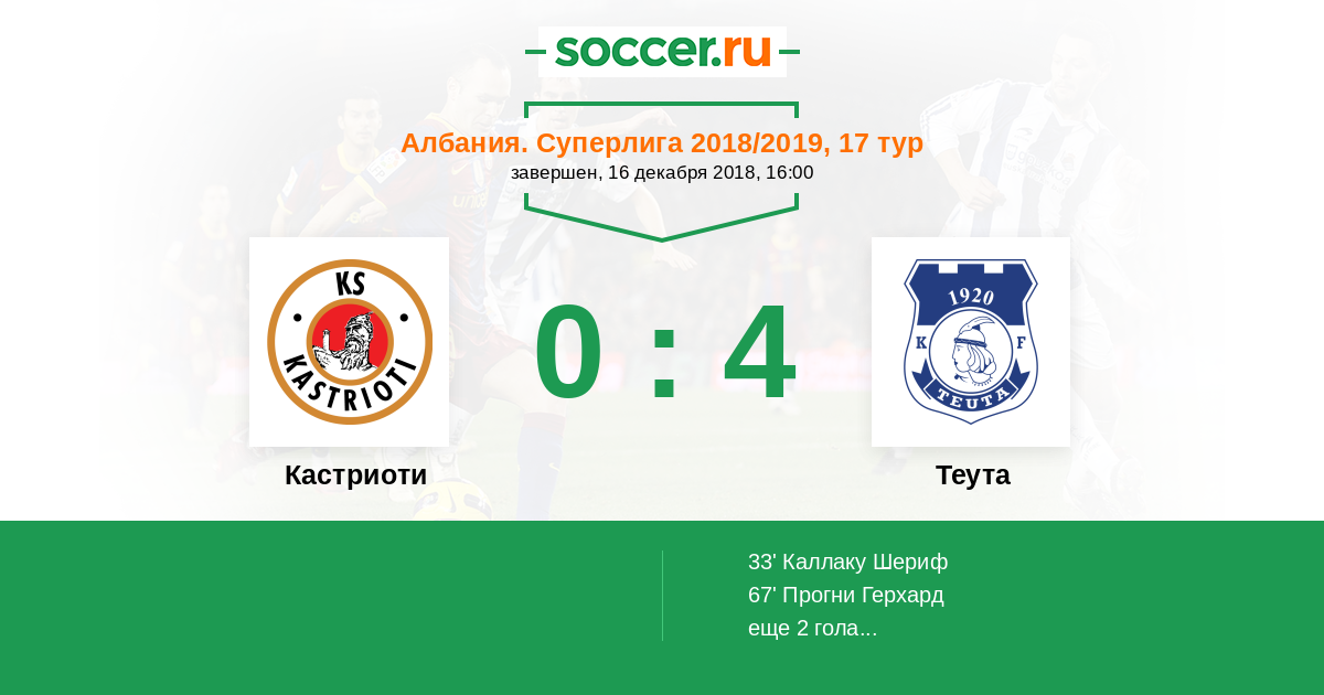 Албания. Суперлига 07.10.2018 Теута Логотип футбольный клуб Теута (Дуррес) 2:0 Логотип футбольный клуб Кастриоти (Круже) Кастриоти