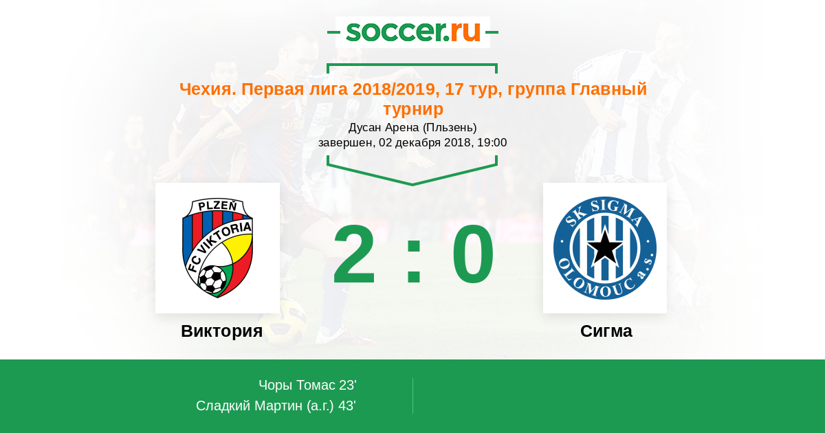 Чехия. Первая Лига 04.08.2018 Сигма Логотип футбольный клуб Сигма (Оломоуц) 0:1 Логотип футбольный клуб Виктория (Пльзень) Виктория