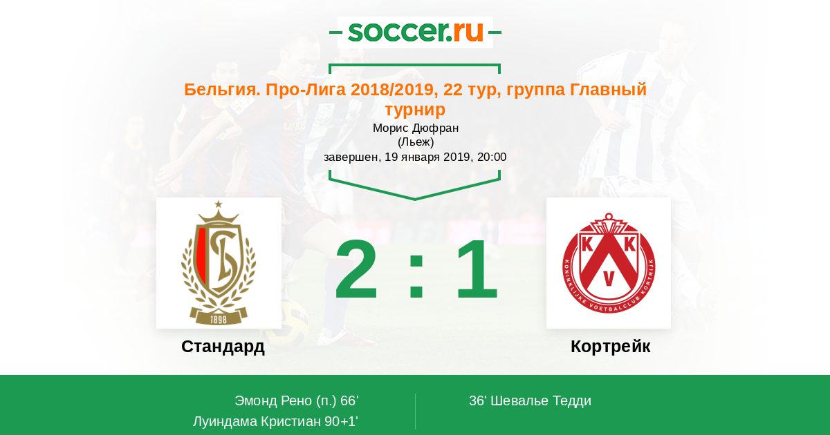 Бельгия. Про-Лига 25.01.2013 Стандард Логотип футбольный клуб Стандард (Льеж) 2:0 Логотип футбольный клуб Кортрейк Кортрейк