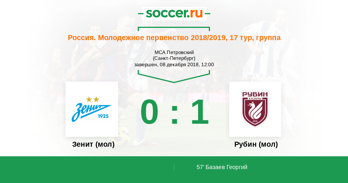 Россия. Премьер-Лига U21 12.08.2018 Рубин (мол) Логотип футбольный клуб Рубин (мол) (Казань) 3:0 Логотип футбольный клуб Зенит (мол) (Санкт-Петербург) Зенит (мол)