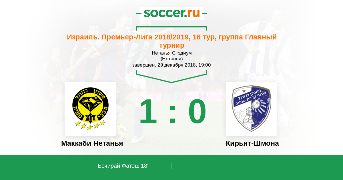 Израиль. Премьер-Лига 29.12.2012 Маккаби Нетанья Логотип футбольный клуб Маккаби Нетанья 3:4 Логотип футбольный клуб Кирьят-Шмона Кирьят-Шмона