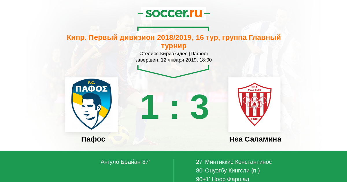 Кипр. Первый Дивизион 21.01.2018 Неа Саламина Логотип футбольный клуб Неа Саламина (Ларнака) 3:0 Логотип футбольный клуб Пафос Пафос