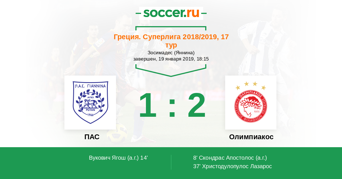 Греция. Суперлига 20.01.2013 Олимпиакос Логотип футбольный клуб Олимпиакос (Пирей) 2:0 Логотип футбольный клуб ПАС (Яннина) ПАС