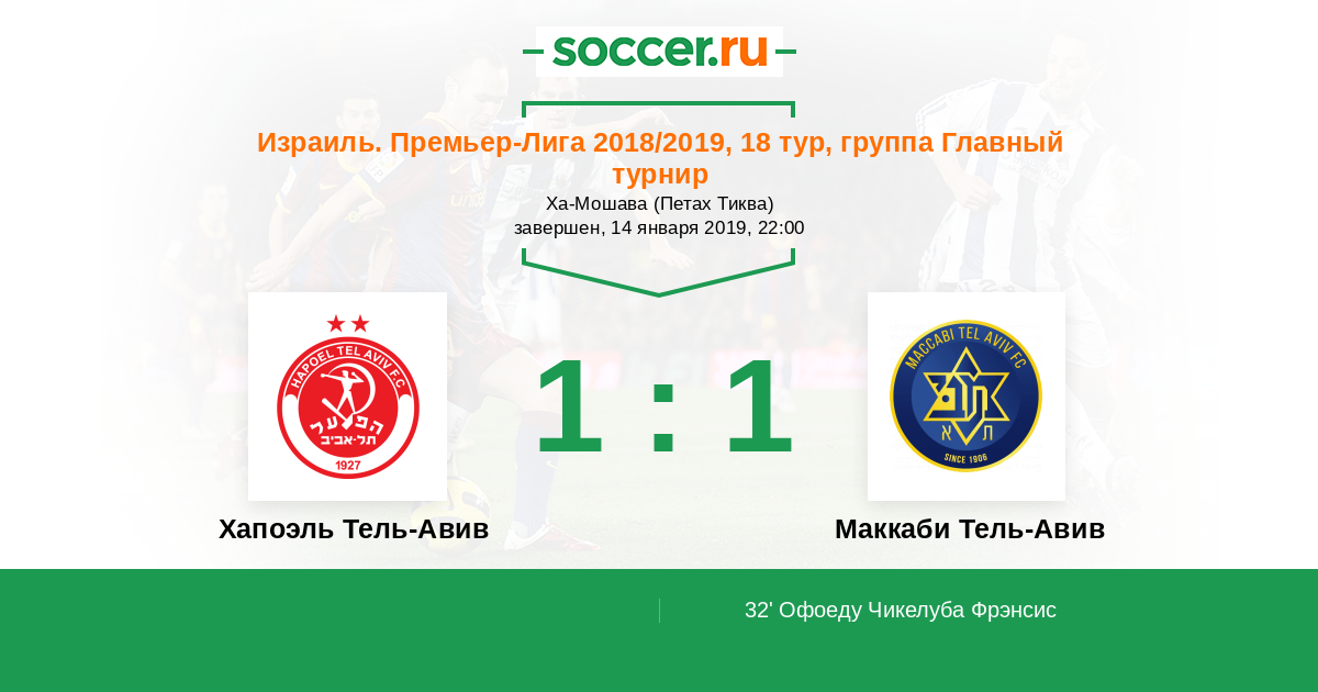 Израиль. Премьер-Лига 06.02.2011 Маккаби Тель-Авив Логотип футбольный клуб Маккаби Тель-Авив 1:1 Логотип футбольный клуб Хапоэль Тель-Авив Хапоэль Тель-Авив