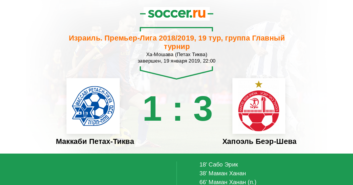 Израиль. Премьер-Лига 01.03.2014 Маккаби Петах-Тиква Логотип футбольный клуб Маккаби Петах-Тиква 1:3 Логотип футбольный клуб Хапоэль Беэр-Шева Хапоэль Беэр-Шева