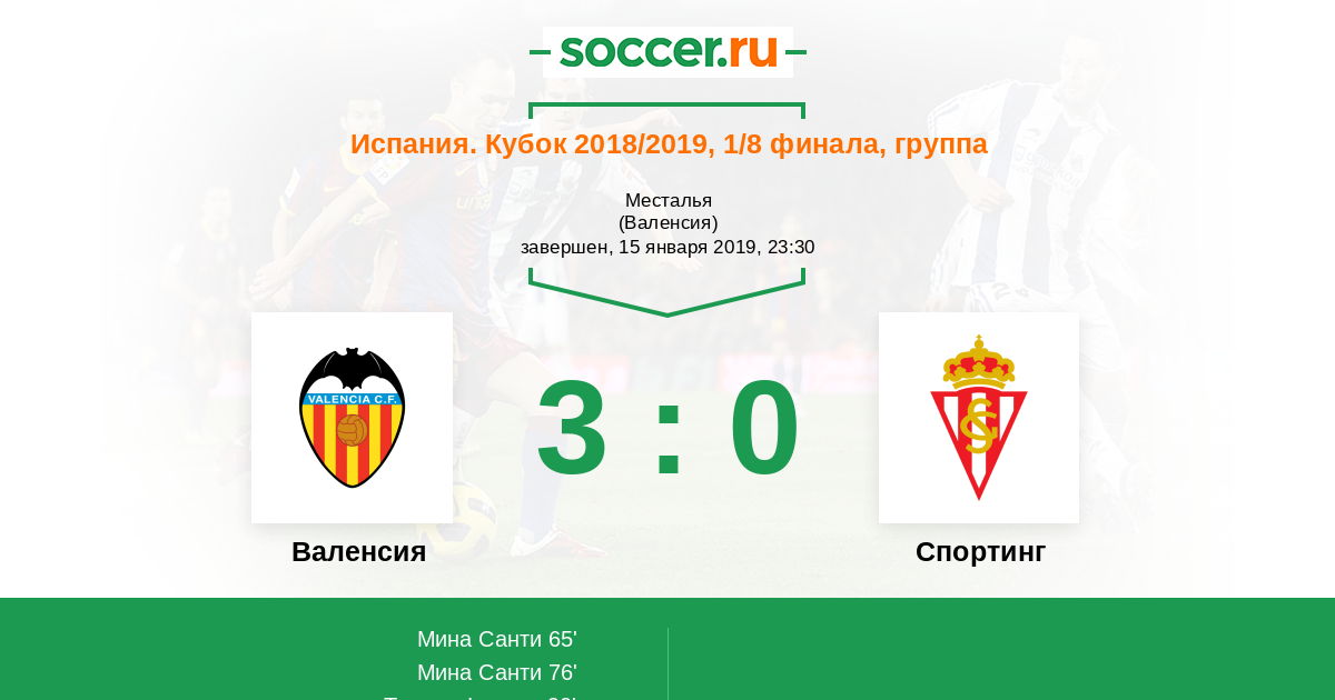 Испания. Кубок 08.01.2019 Спортинг Логотип футбольный клуб Спортинг (Хихон) 2:1 Логотип футбольный клуб Валенсия Валенсия
